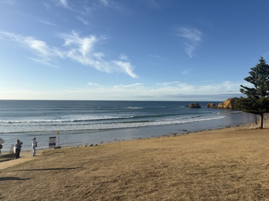 Drove through several small towns including Lorne, until we came to Apollo Bay. We stopped here for lunch. At at George’s cafeteria. Built especially for tourists by the look of it. Clean and bright and food was actually good. The orders turned out in record time for us on tour busses. Ken had fish and chips…. I managed to look around and see they had roasted chickens so ordered 1/4 chicken and salad.